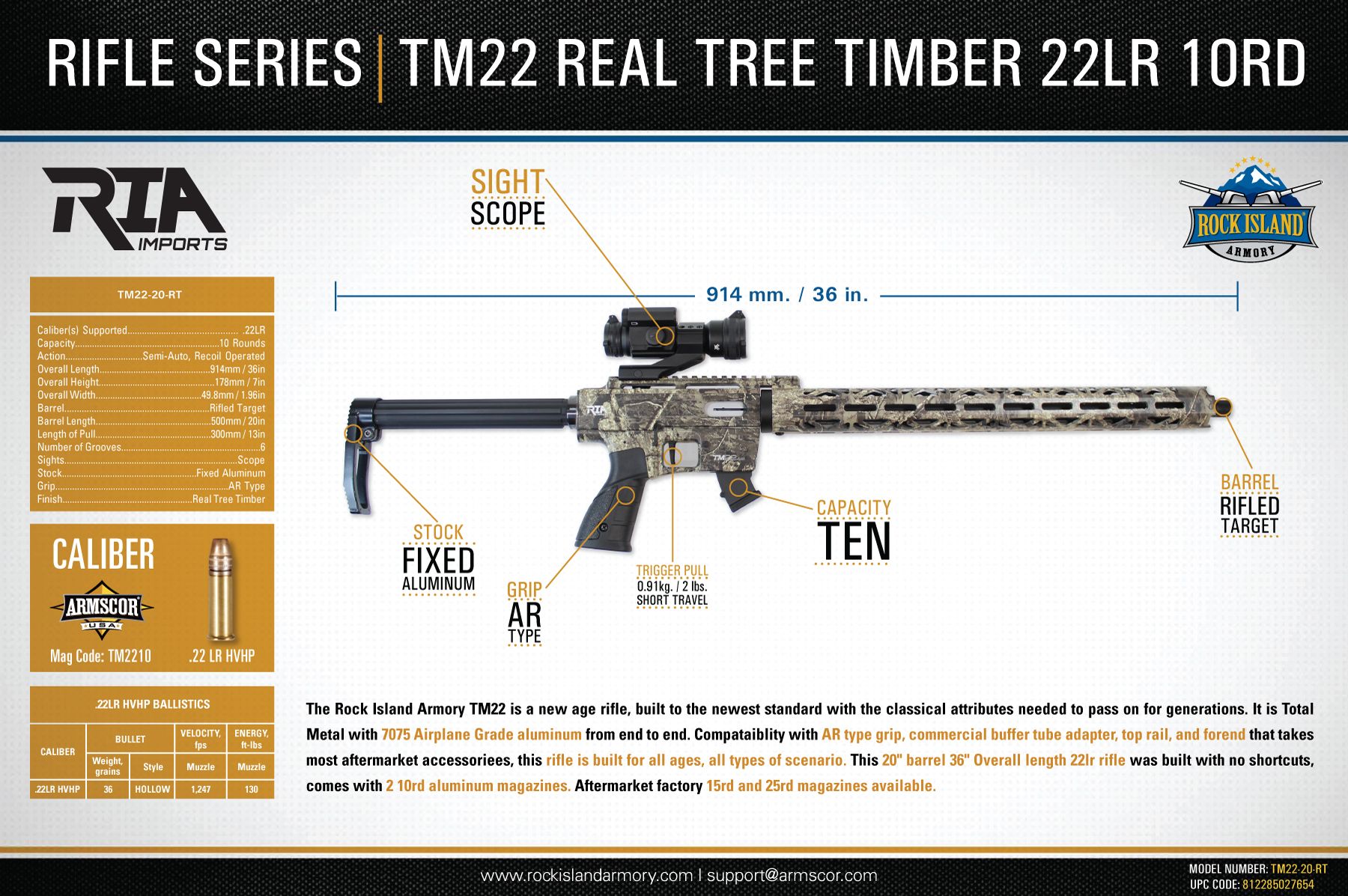 The Rock Island Armory TM22 is a new age rifle, built to the newest standard with the classical attributes needed to pass on for generations It is Total Metal with 7075 Airplane Grade aluminum from end to end. Compatible with AR type grip, commercial buffer tube adapter, top rail, and forend that takes most after market accessories, this rifle is built for all ages, all types of scenarios. This 20" barrel 36" Overall length 221r rifle was built with no shortcuts, comes with 2 10rd aluminum magazines. 15rd and 25rd magazines available.