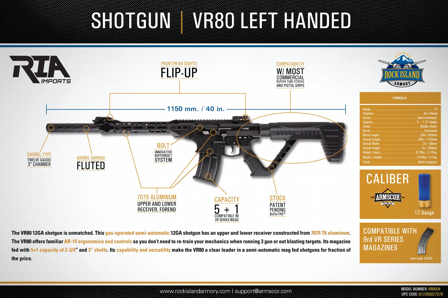 The VR80 12GA shotgun is unmatched. This gas-operated semi-automatic 12GA shotgun has an upper and lower receiver constructed from 7075 T6 alumninum. The VR80 offers familiar ergonomics and controls so you don't need to re-train your mechanics when running 3 gun or out blasting targets. It's MRB Fixed with a 5+1 capacity of 2-3/4" and 3" shells. Its capability versatility make the VR80 a clear leader in semi-automatic shotguns for a fraction of the price.